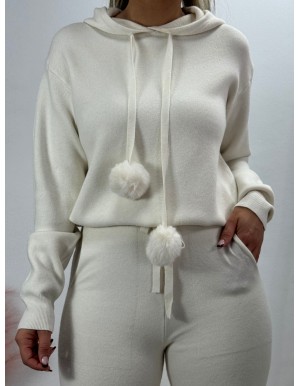 Conjunto de punto de dos piezas que combina sudadera modelo oversize con gorro y cordones que acaban con borlones de pelitos. Pantalón recto de talle super alto con cinturilla elástica, cordón ajustable y bolsillos a los lados. Tejido cálido, muy cómodo y adaptable.