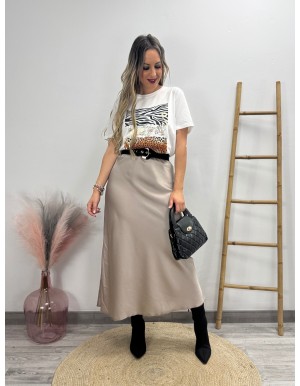 Falda midi de raso de lunares con elástico en la cintura. Tejido muy cómodo y suave.