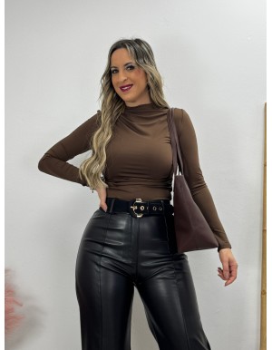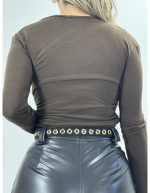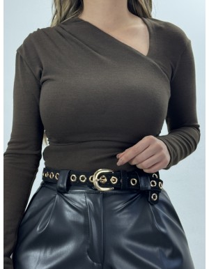 Camiseta de manga larga con forma de pico en el lado izquierdo y fruncido en los lados. Tejido elástico, cómodo y adaptable.