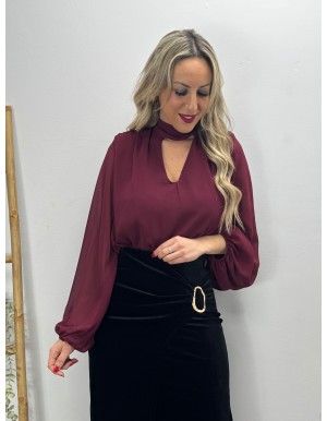 Camisa de gasa con tira en el cuello que se anida en la parte trasera y espalda abierta. Mangas abullonadas, hombreras y escote en forma de pico.
