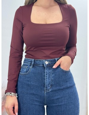 Camiseta básica de manga larga con escote cuadrado. Tejido elástico y adaptable.