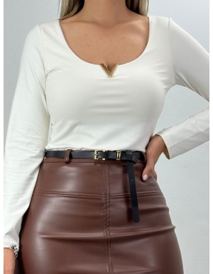 Camiseta de manga larga con super escote y detalle de broche en el medio. Tejido elástico y adaptable.
