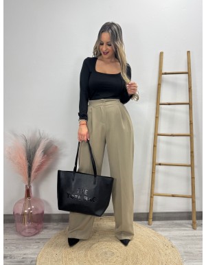 Pantalón recto de pinza modelo ancho de talle super alto con cinturilla fruncida y elástica. Bolsillos a los lados.