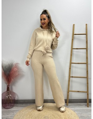 Conjunto de punto de dos piezas que combina sudadera modelo oversize con gorro y cordones que acaban con borlones de pelitos. Pantalón recto de talle super alto con cinturilla elástica, cordón ajustable y bolsillos a los lados. Tejido cálido, muy cómodo y adaptable.