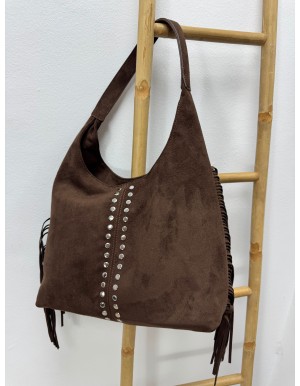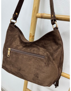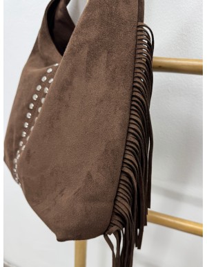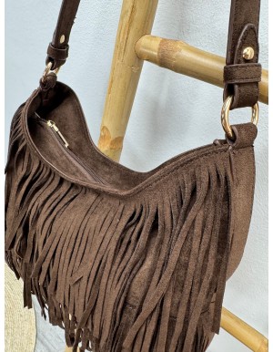 Bolso de antelina con detalle de flecos en la parte delantera. Asa para colgar y cremalleras interiores y en la parte trasera. Muy ligero y cómodo.