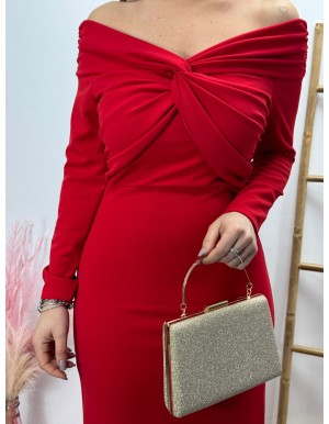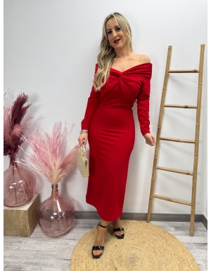 Vestido midi de manga larga con escote en forma de barco fruncido en la parte del pecho. Abertura trasera. Tejido muy elástico comodo y adaptable.