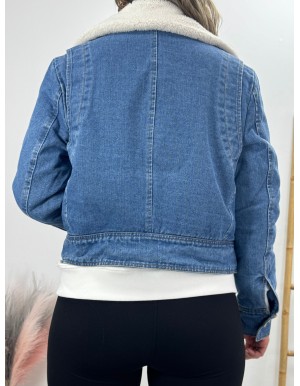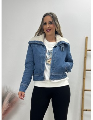 Chaqueta vaquera con borreguito en el interior, cuello alto con detalle de hebillas, cremallera en el interior y bolsillos a los lados.