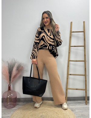 Conjunto de punto de dos piezas que combina sudadera modelo oversize con gorro y cordones que acaban con borlones de pelitos. Pantalón recto de talle super alto con cinturilla elástica, cordón ajustable y bolsillos a los lados. Tejido cálido, muy cómodo y adaptable.