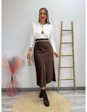 Falda pantalón estilo pareo con detalle de broche en el lado izquierdo, cremallera invisible y pantalón en la parte trasera. Tejido muy elástico y adaptable.