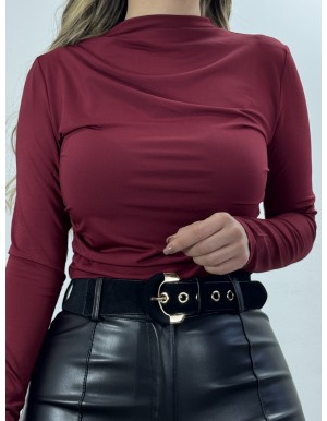 Camiseta de manga larga de tejido elástico y adaptable con fruncido en el hombro y en los lados.