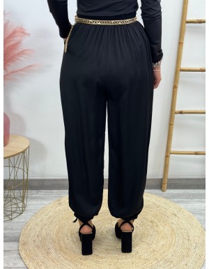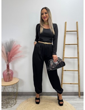 Pantalón largo de raso con puño. Talle super alto con cinturilla fruncida elástica y bolsillos a los lados.