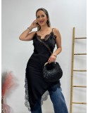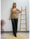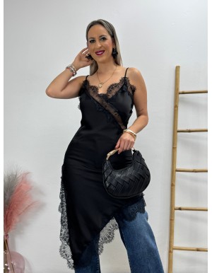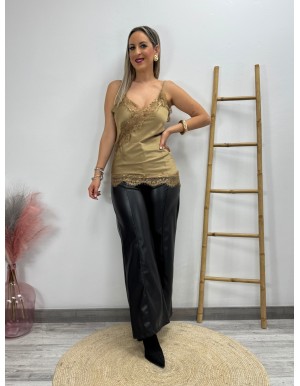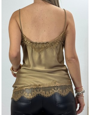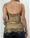 Camiseta lencera de raso de tiranta fina con encaje en el escote, en diagonal debajo del pecho y en la parte trasera. Espalda fruncida y elástica para una mejor adaptación.