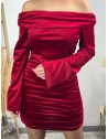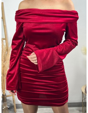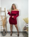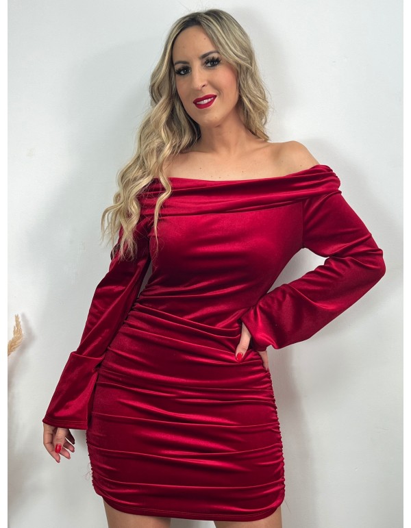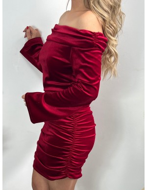 Vestido de terciopelo con escote de barco, con manga larga. Drapeado en la parte inferior delantera y trasera. Tejido elástico y adaptable.